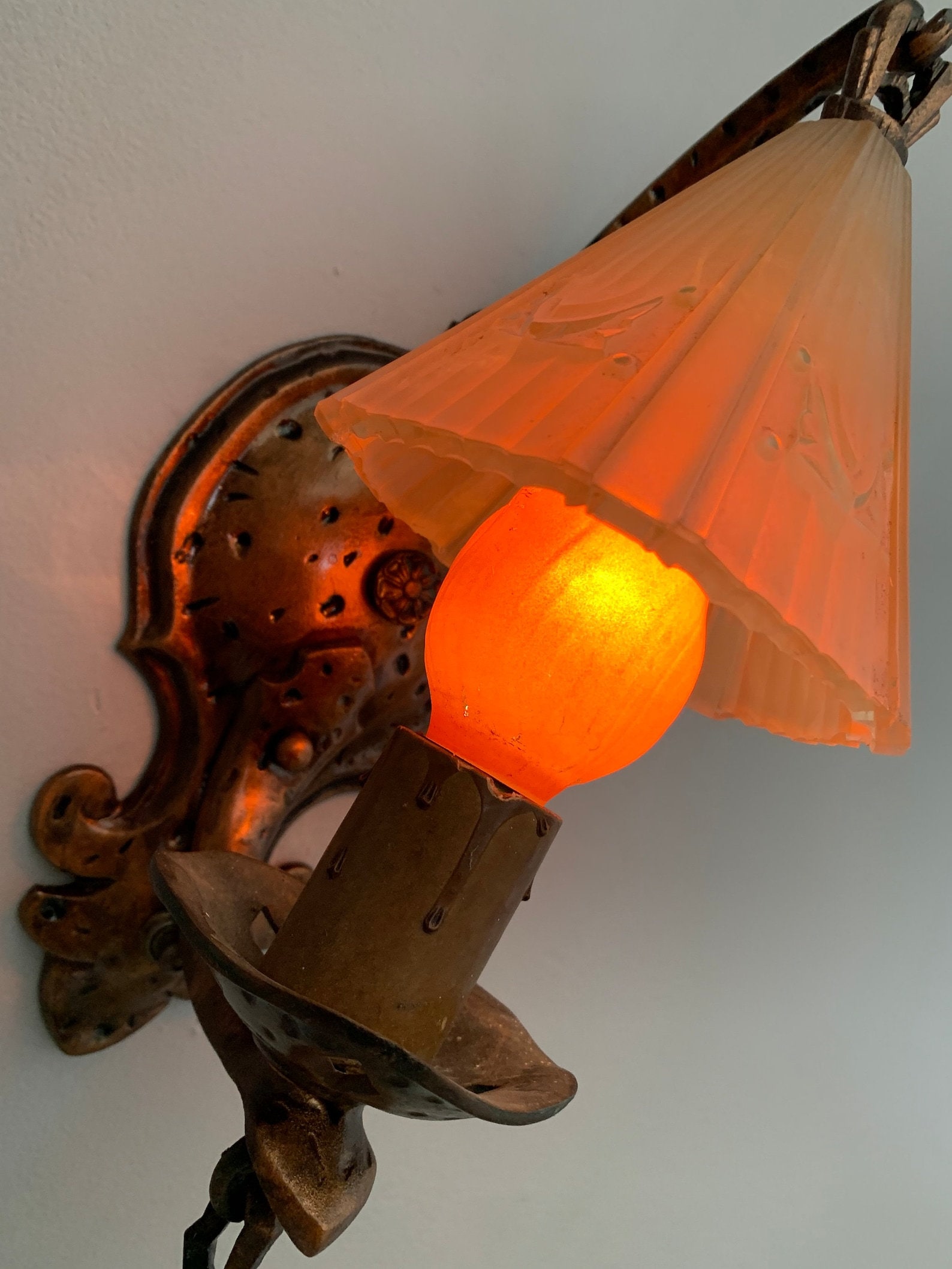 The fixture is made of ornamental cast aluminum with original deep bronze metallic finish with hammered decor. The impressive glass slip shades features a baked enamel with an amber/honey finish. The single matching shade is very rich with an organic perforated elements in relief. An exquisite addition to your home!
