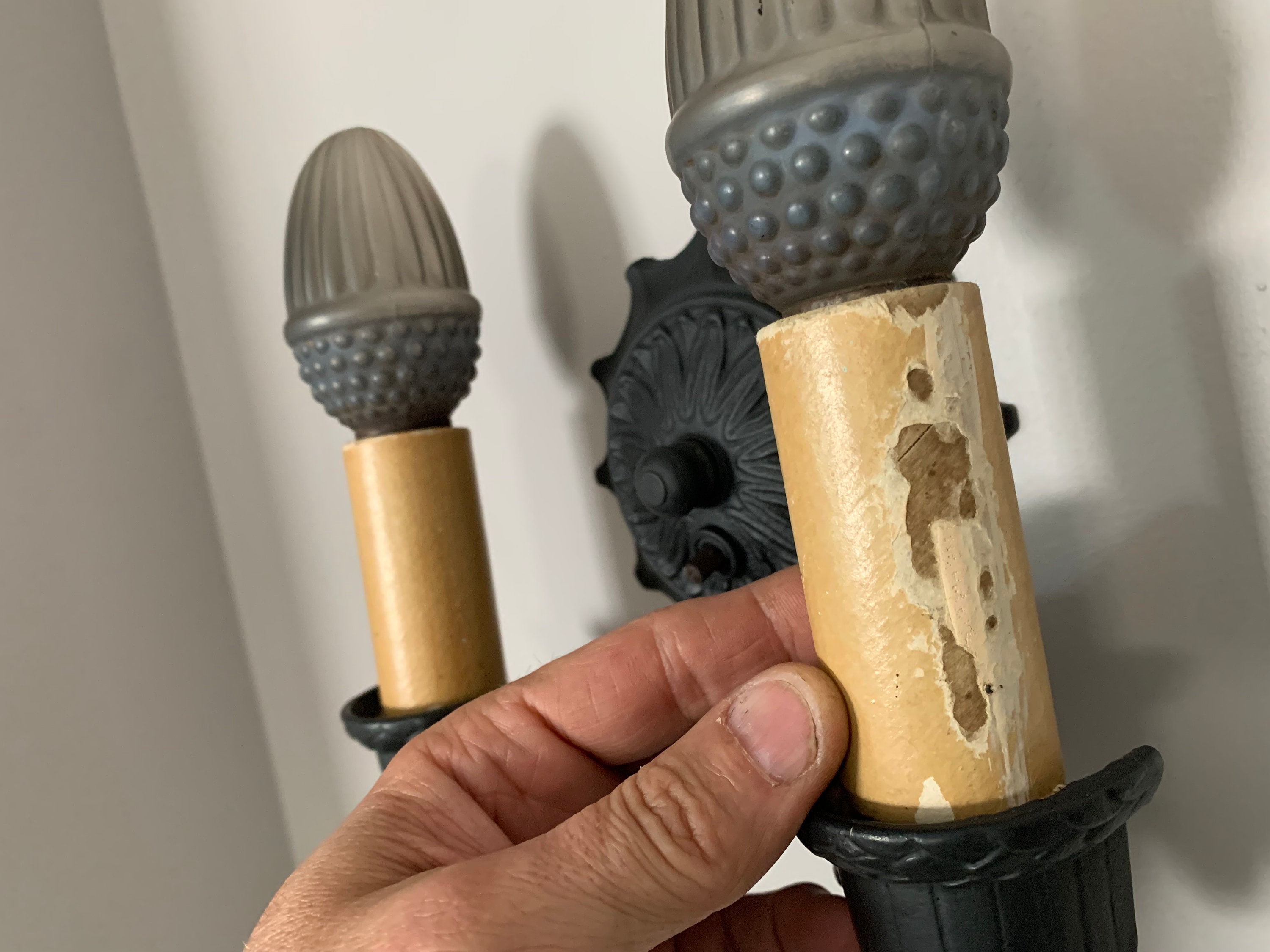 Many cast iron fixtures do not survive grandpa's shed without substantial rust destroying the finish. This sconce one of them. The fixture has been scrubbed and refinished corrosion resistant charcoal black. There are several 'Markel Web' ceiling fixtures located within the store. The candle cover shows wear on one side- not visible when facing toward the wall.